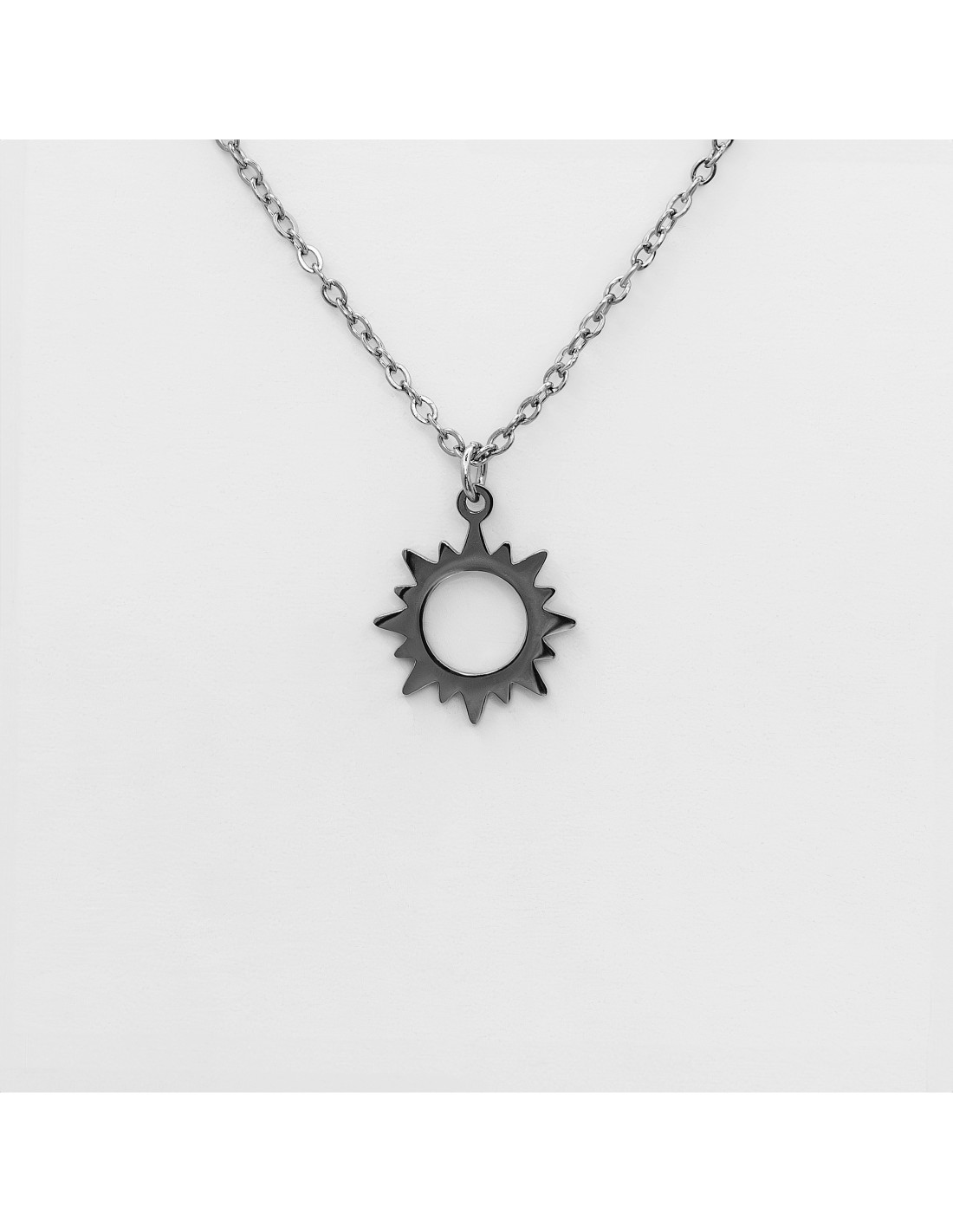 Collar con dije de sol de 1,20cm de ancho y 1cm de largo. Cuenta con una cadena de 43,5cm de largo ajustable para tu comodidad.