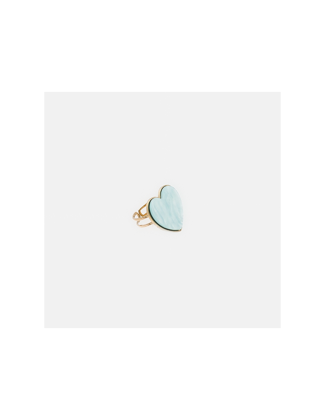 Anillo dorado de forma corazón en color celeste, verde y blanco .