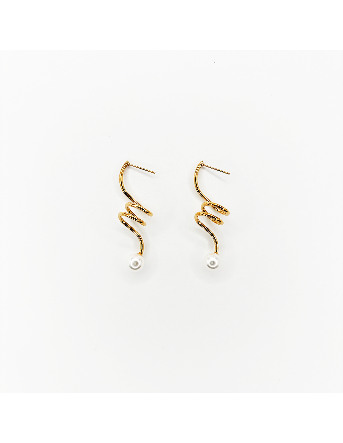 Pendientes con diseño en espiral y perla en el extremo, disponibles en acabado dorado y plateado. La pieza forma una espiral abierta de líneas suaves y fluidas, aportando un estilo moderno y original.