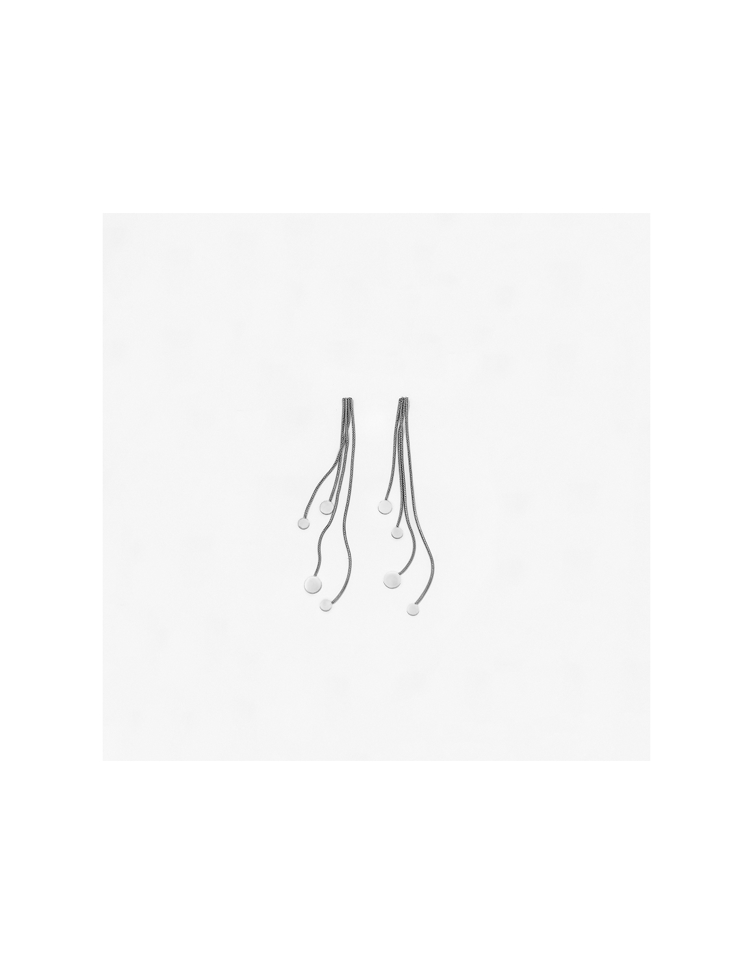 Pendiente con forma alargada y pequeños circulos colgantes en color oro y plata. El pendiente mide 8,5cm de largo y 5mm de ancho.