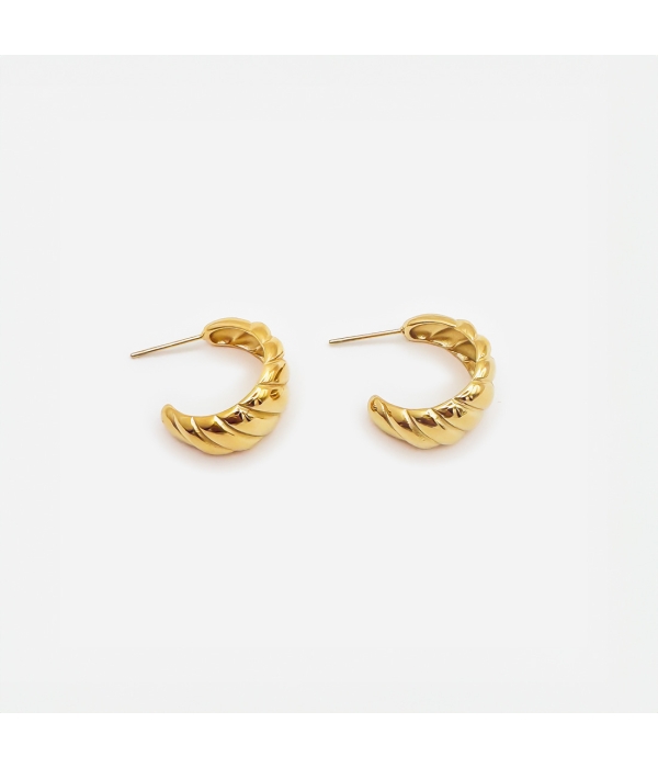Aro con forma abierta y detalles de líneas en color oro. El pendiente tiene un tamaño de 2cm y un grosor de 1cm.